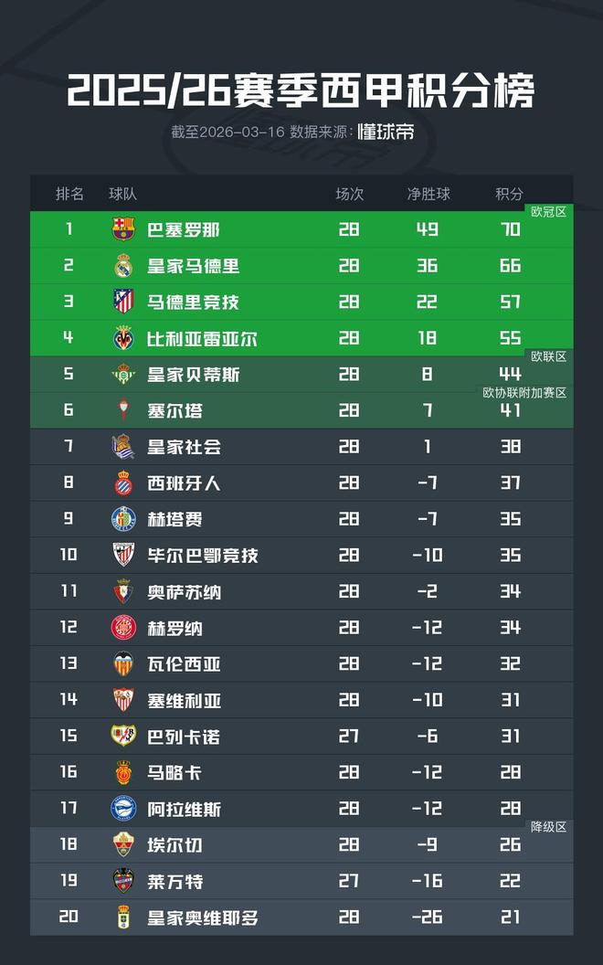 保级方面,埃尔切26分排名第18位,与保级区的马略卡和阿拉维斯相差2分,本轮尚未进行比赛的莱万特则积22分排名倒数第二。